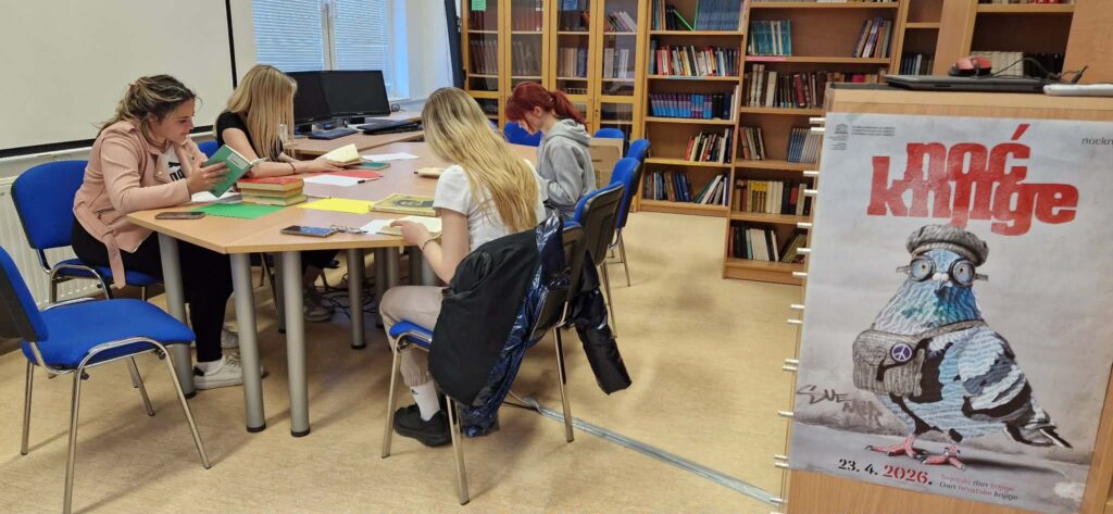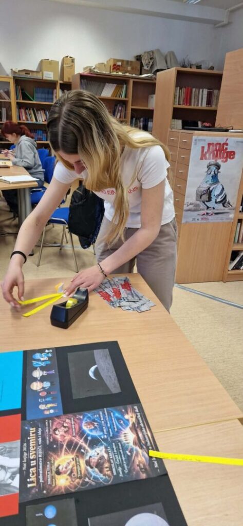 Povodom manifestacije “Noć knjige” u našoj školi održana je kreativna radionica pod nazivom „Lica u svemiru: pobratimstvo riječi, rada i ideja“. Ova inspirativna aktivnost povezala je stvaralaštvo kroz simboliku planeta te djela četiriju velikih autora: Nikole Tesle, Federica Garcíe Lorce, Miroslava Krleže i Jorgea Luisa Borgesa.