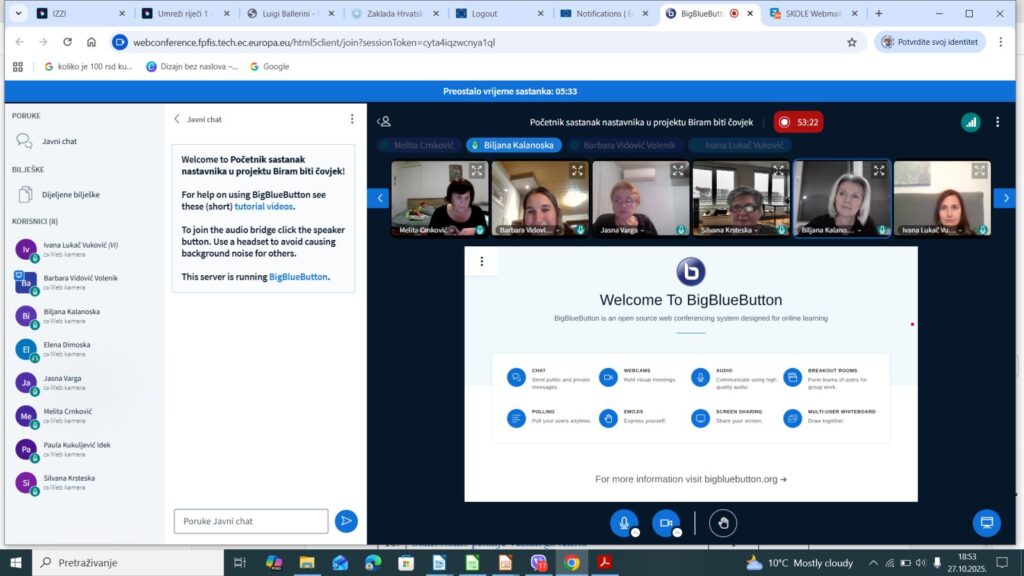 U eTwinningovu projektu Biram biti čovjek 27. 10. 2025. održan je prvi radni sastanak nastavnika koji sudjeluju u projektu. U projektu sudjeluju 22 nastavnika iz različitih škola. Nastavnici su se predstavili i razgovarali o projektnim aktivnostima koje slijede.